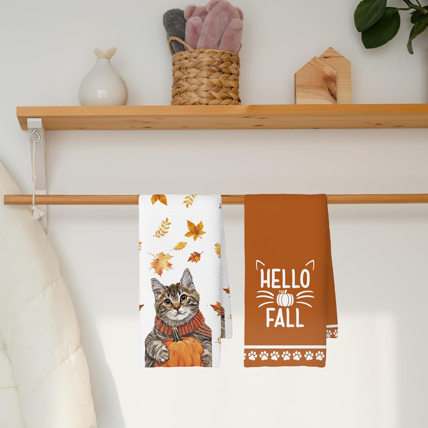 Fall Pumpkin Cat Orange Kitchen Towels Set of 2, Autumn Harvest Maple Leaves Tea Towel, Thanksgiving Home Decoration, Pumpkin Patch Seasonal Tea Towels Kitchen Hand Towels 16x24 Inch